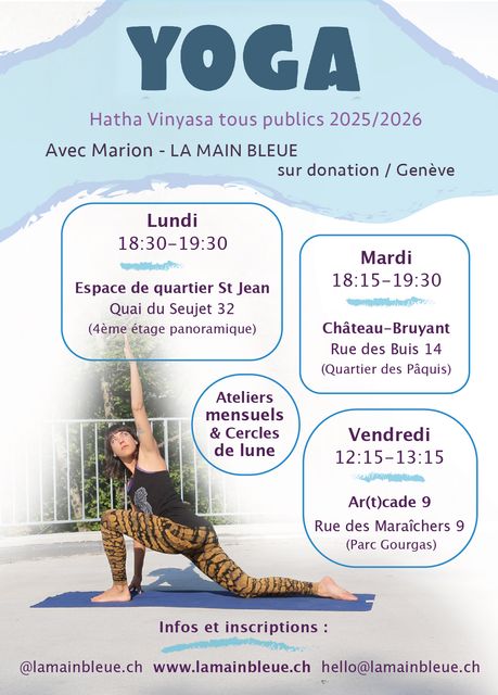 Les autres cours en extérieur se poursuivent tant que la météo le permet en septembre-octobre (voir mises à jour sur groupes d'infos ). Sur donation libre, apporte ton tapis!